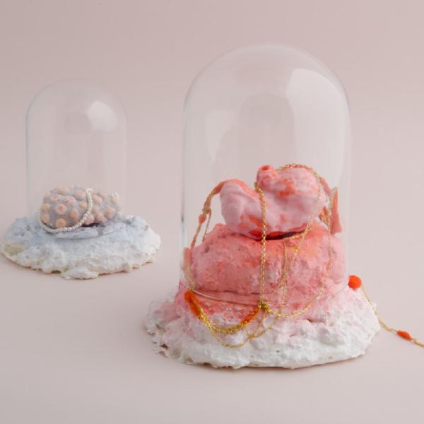 The glass cloches (with an amorphous base) protect the imagination, while at the same time allowing a glimpse. They evoke the feeling of the vulnerability and fragility of imagination.